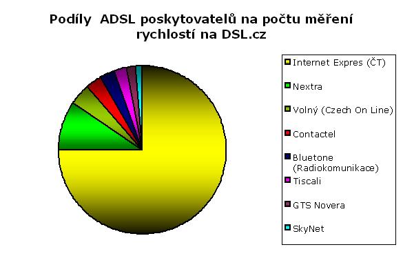 Následující graf vychází z počtu měření rychlostí ADSL v síti Českého Telecomu na DSL.cz u největších poskytovatelů. I když počet měření nemusí zcela shodně odrážet tržní podíl, tak je naprosto zřejmé, že dominantní postavení Českého Telecomu na trhu s ADSL zatím není ohroženo ani spojením sil GTS Novery, Contactelu a Nextry.