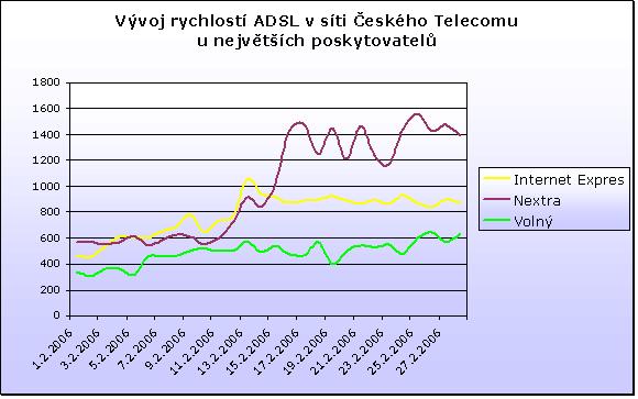 Graf dokazuje, že větší počet migrací přípojek na vyšší rychlosti byl proveden po počátečních obtížích až počátkem třetího únorového týdne. Zajímavé je i porovnání dosahovaných průměrných rychlostí jednotlivých poskytovatelů. Průměrný zákazník Nextry má objednanou službu s dvojnásobnou rychlostí oproti Volnému. Důvod je jednoduchý. Zatímco se Volný kvůli nabídce vhodných služeb pro své dial-up klienty vloni soustředil na nabídku nejlevnějších variant ADSL o rychlostech 128 a 256 kbit/s, Nextra ADSL s rychlostí pod 512 kbit/s od jara loňského roku ani nenabízela.