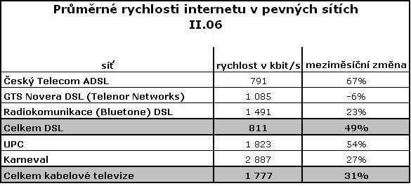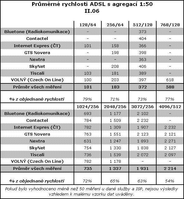Důsledkem tohoto navyšování rychlostí byl téměř trojnásobný vzestup počtu měření rychlostí ADSL v síti Českého Telecomu na serveru DSL.cz. Tím se podařilo dále výrazně zpřesnit vypočtené hodnoty o průměrných dosahovaných rychlostech, které jsou uvedeny v následující tabulce.