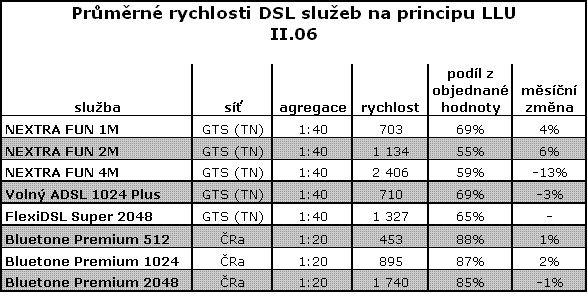 Na nabídku nových služeb na principu LLU na platformě GTS Novera (dříve Telenor Networks) si budeme muset ještě pár týdnů počkat. Radiokomunikace sice nabídly nové ADSL služby s rychlostí až 5 Mbit/s ve své síti Bluetone již před měsícem, ale vzhledem k poměrně dlouhé době mezi objednávkou a samotnou aktivací ADSL u této společnosti zatím rychlosti nových služeb naměřeny nemáme. Nicméně dosahované rychlosti u Radiokomunikací patří v poměru k objednaným službám k trvale nejlepším, což potvrzuje i následující tabulka.