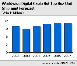 Celkově se trh s STB zvedl v loňském roce o celou třetinu. Hlavní podíl na distribuci STB mají stále kabeloví poskytovatelé více služeb (MSO, Multi-Service Operators), kteří musí ovšem reagovat na konkurenci jak ze strany poskytovatelů satelitních služeb i DSL. Celosvětově největší podíl na trhu s STB si udržuje Motorola s 38% trhu v roce 2003 (podle analytiků společnosti ABI). Na paty jí šlape Scientific-Atlanta, která dosáhla podílu 28%. Hlavní důvod zájmu právě o její STB se přisuzuje zabudované podpoře pro DVR (Digital Video Recording). DVR se rychle uplatnilo v satelitních sítích, ale nastupuje také v kabelových sítích. Další konkurenci pro tyto dvě vedoucí firmy představují - zejména mimo USA - výrobci jako Pace, Pioneer a Philips.