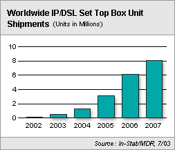 STB s podporou protokolu IP pro širokopásmové přípojky typu DSL (IP/DSL STB) byla zatím odkázána na okrajový trh. IP/DSL STB jsou na trhu sice od konce 90. let, kdy se však prodalo jen několik tisíc kusů, ale teprve vloni se poptávka začala pohybovat v řádu set tisíc.