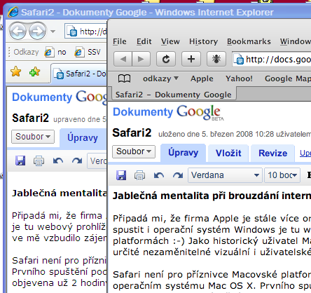 Rozložení ovládacích prvků je stejné jako u IE 7, tedy pruh s nabídkami, standardní lišta s ovládacími prvky, polem pro adresu a vyhledávání, odkazy a lišta se záložkami. Status bar je standardně vypnut. Ovládání Safari je totožné se zaběhlým standardem, Ctrl+N otevře nové okno, Ctrl+T novou záložku v okně. O rychlosti zobrazení, které je významným marketingovým lákadlem, se tu přít s nikým nebudu. Upřímně řečeno-napsáno, na 4 Mbit lince jsem rozdíly nepoznal a doma na 2 Mbitu také ne. Co však zarazí na první pohled, je "poněkud" silnější písmo, a to jak na LCD tak i obyčejném monitoru.