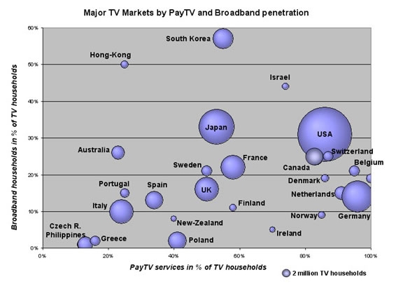 Pro zajímavost: následující obrázek ze zprávy TDG Research IP Television: Business Case Analysis & Global Forecasts uvádí porovnání jednotlivých zemí na základě penetrace širokopásmových přípojek a placené TV jako základu pro rozvoj IPTV ukazuje.