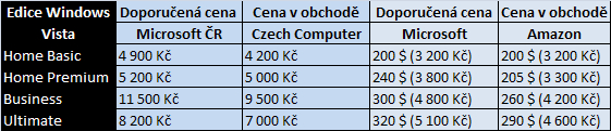 Nejdříve si řádově srovnejme ceny Windows Vista u nás a ve Spojených státech. Už teď prozradím, že plná (krabicová) verze Windows Vista se u českých zákazníků setkává s nicotným zájmem. Zanedbatelný podíl prodaných krabicových verzí má určitě svůj původ v jejich vysoké ceně. Microsoft je sice nedávno zlevnil skoro až o polovinu (!), ale i tak jsou výsledné částky pro průměrného Čecha nepřijatelné. Ceny krabicových verzí Windows Vista se obyčejně pohybují v následujících relacích: Edice Business u nás stojí kolem 9 500 Kč, kdežto třeba na Amazon.com je k dostání za zhruba 260 dolarů, tj. při dnešním kursu asi 4200 Kč; populární Home Premium po velké slevě u nás stojí 5 800 Kč a na Amazonu 205 dolarů, tj. 3300 Kč. Instalační DVD plné verze Ultimate po slevě má doporučenou cenu 8 200 Kč (v českých e-shopech se pohybuje už i kolem 7 000 Kč), na Amazonu ji však koupíte za 290 dolarů, tedy 4 600 Kč. A to nesmíme zapomínat rovněž na to, že zatímco medián platu v ČR se pohybuje kolem 20 000 Kč, v USA činí asi 2 400 dolarů, tj. něco přes 38 000 Kč. Pro lepší přehled následující tabulka.