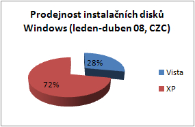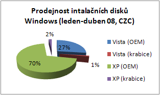 Bohužel se nejde dobrat přesné odpovědi na otázku, kolik procent z licencí jde na triko předinstalovaným Windows Vista na prodaných noteboocích a desktopech, ale i tak můžeme najít zajímavé údaje. Tak především: Windows XP se pořád prodávají mnohem lépe než Visty. Jmenovitě u samostatných instalačních disků za období leden-duben 2008 vedou „XPéčka“ nad Vistami v poměru 72:28. To znamená, že skoro tři čtvrtiny ze všech prodaných instalační disků Windows tvoří ty s XP, jen jedna čtvrtina patří Vistám.