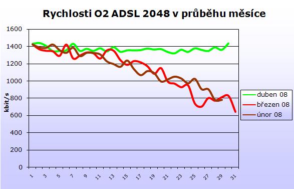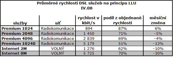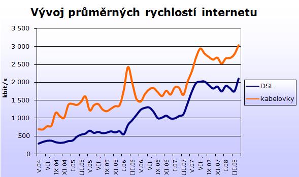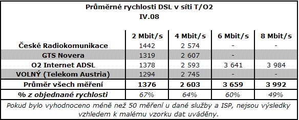 K nejvýznamnějšímu zlepšení došlo u DSL sítě T/O2 (Telefóniky O2). Zvýšení průměrných rychlostí o čtvrtinu proběhlo v důsledku zrušení FUP u všech služeb. Průměrné rychlosti DSL sítě T/O2 tak dosáhly historicky rekordních 2 091 kbit/s. Následující graf ukazuje vývoj rychlostí DSL a kabelového internetu v posledních 4 letech.