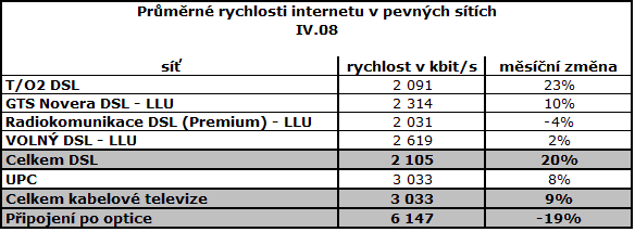 Průměrné rychlosti zákazníků největšího poskytovatele kabelového internetu UPC v dubnu poprvé přesáhly hranici 3 Mbit/s. Postupná migrace zákazníků UPC na vyšší rychlosti je plánovaná do června, a proto se dá předpokládat, že průměrné rychlosti UPC se budou v příštích měsících dále zvyšovat.