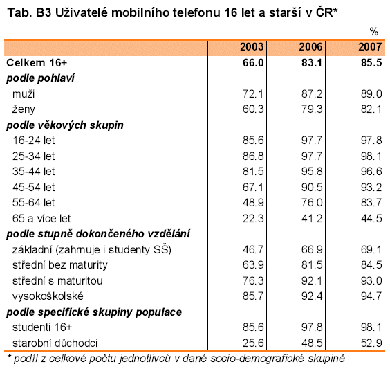 Pokud bychom chtěli vědět, kolik lidí má v ČR mobilní telefon – či spíše kolik lidí jej stále ještě nemá – museli bychom se obrátit na jiné statistiky. Nejspíše na ty od Českého statistického úřadu (zdroj), které ukazuje následující tabulka.