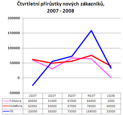 Tak třeba čtvrté čtvrtletí bývá tradičně nejbohatší na nové přírůstky. Nejspíš proto, že lidé před Vánoci hodně nakupují, čemuž se mobilní operátoři rádi přizpůsobují zaměřením a načasováním svých marketingových aktivit. Naznačuje to ostatně i následující graf, který ukazuje čtvrtletní přírůstky všech tří našich mobilních operátorů za rok 2007, a ještě za první čtvrtletí roku 2008.