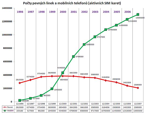 Kdysi hodně dávno, ještě v minulém století, mobilní telefony v ČR vůbec neexistovaly. Objevovat se začaly až od září 1991, kdy byla spuštěna první mobilní síť společnosti Eurotel (postavená ještě na analogové technologii NMT). Bylo jich ale relativně málo a počtu pevných telefonů (resp. pevných telefonních linek) konkurovat rozhodně nemohly.V roce 1996 byly spuštěny hned dvě další mobilní sítě, již na technologii GSM, v podání Eurotelu a Radiomobilu. Mobilních telefonů pochopitelně dále přibývalo, ale tempo jejich růstu bylo stále ještě menší, než u pevných telefonních linek. Mobilní technologie byly zkrátka ještě příliš mladé a trh prahnul spíše po tom, co už dobře znal.