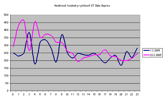 hodinové porovnání dosahovaných rychlostí CDMA mezi úterkem 1.3.2005 a stejným