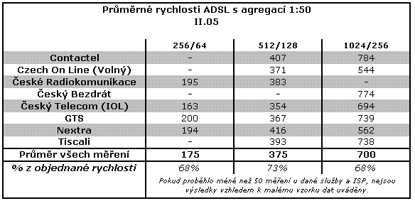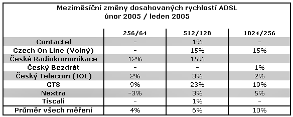 Slušné zvýšení rychlostí zaznamenali zákazníci Czech On Line, Českých Radiokomunikací a GTS. U posledně jmenované společnosti dosahovaly v roce 2004 naměřené rychlosti služeb spíše horších hodnot. Důvodem byl relativně vysoký poměr počtu uživatelů, kteří podléhali Fair Use Policy kvůli tomu, že společnost nepožaduje platby za překročení datových limitů. I když u GTS k žádným změnám ve Fair Use Policy v posledních měsících nedošlo, lze od listopadu 2004 sledovat zřetelné zlepšování naměřených rychlostí. Velmi pravděpodobným důvodem je nárůst počtu zákazníků. Ke změnám Fair Use Policy přistoupila od začátku března Czech On Line, u které byla dříve pro mnoho uživatelů Fair Use Policy málo transparentní. Uživatelé Czech On Line nyní podléhají Fair Use Policy na podobných principech jaké používá Český Telecom u služeb Internet Expres. Načítání dat probíhá v týdenním cyklu počínaje pátkem 15.00 h, kdy je všem uživatelům nastavena maximální rychlost. Týdenní datové limity jsou u Czech On Line pro aktivnější uživatele v porovnání s Českým Telecomem příznivější.