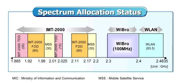 Korea před třemi lety uvolnila spektrum 2,3 GHz pro komunikační účely a vyčlenila 100 MHz z tohoto pásma pro přenosný Internet (viz obrázek znázorňující korejské národní přidělení spektra). WiBro (Wireless Broadband) je korejská norma využívající právě toto pásmo a je technicky velice podobná připravované normě mezinárodní 802.16e, tj. rozšíření WiMax pro mobilní účely.