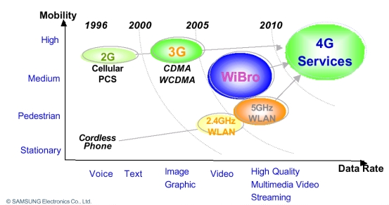 Ze současného pohledu se WiBro nachází někde mezi WLAN a mobilními službami, ale jako nejnovější technologie má přímo navazovat na sítě 4G, které mají poskytovat vyšší rychlosti i mobilitu, viz následující obrázek: