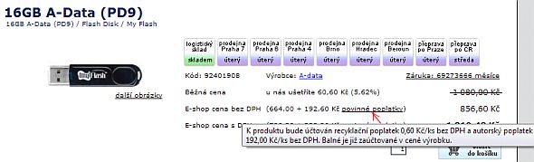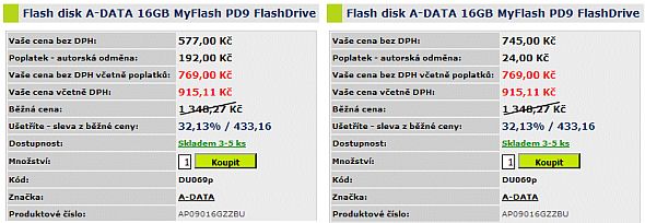 U některých prodejců s příchodem nového roku zůstala výsledná cena beze změny, a změnilo se jen rozepsání jejích dílčích složek, včetně autorského poplatku. První příklad vidíte na následujících dvou obrázcích, ukazujících zboží již na skladě koncového prodejce: levý je ještě z loňského roku, kdy se z flash paměti 16 GB platil poplatek 192 Kč, a pravý cca z 5. ledna 2009, kdy už se ze stejné paměti platí jen 24 Kč.