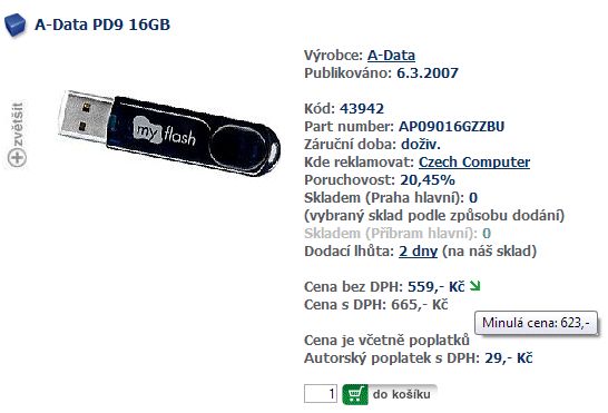 Jiný prodejce zase dodnes uvádí původní (loňskou) výši autorských poplatků (192 Kč za 16 GB flash paměť), jak dokládá následující obrázek (originál zde). Zřejmě ještě nedoprodal loňské zásoby na svém logistickém skladě (viz nejlevější zelené políčko), a přijde mu korektní uvádět již skutečně zaplacenou výši autorského poplatku. Nebo že by změnu autorských poplatků ještě vůbec nezaregistroval?