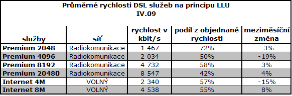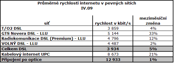 Další zrychlení internetu u většiny významných poskytovatelů. Kabelový internet s rychlostmi v průměru 8,7 Mbit/s zvyšuje odstup od DSL s průměrnou rychlostí 3,9 Mbit/s. Mobilní internet v CDMA sítích 550 kbit/s u O2, U:fonův internet 325 kbit/s. Výrazné zrychlování bezdrátových sítí.