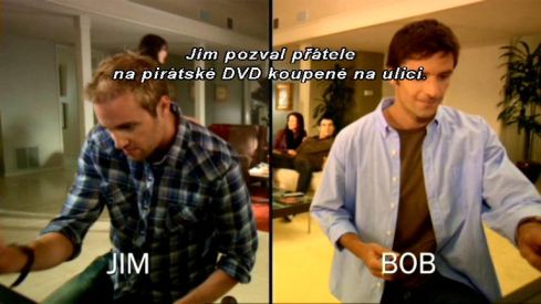 V první variantě si tuším Bob koupí legální DVD. Těší se se svými přáteli z úžasného obrazu a zvuku, přitom pojídají pizzu, popíjejí Colu a plácají se při každé akční scéně do dlaní. Zatímco Jim sedí doma u počítače a snaží se film stáhnout. Pořád mu chudákovi padá připojení, pak mu písmeny velkými jak kráva počítač sdělí, že se bude stahovat ještě 253 hodin a chudák Jim sedí zdrceně s rukama v dlaních. Měl si koupit legální DVD a měl by po problémech!
