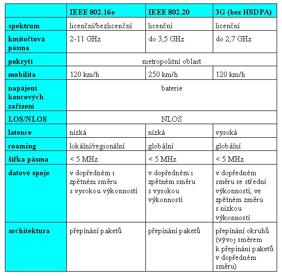 Doplňme ještě porovnání jednotlivých technologií, které přicházejí v úvahu pro mobilní uživatele (viz též článek Mobilní širokopásmový přístup: 802.16e nebo 802.20):