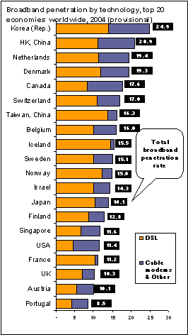 International Telecommunication Union) podílu různých technologií na trhu širokopásmových přípojek u prvních dvaceti zemí na žebříčku širokopásmových velmocí: