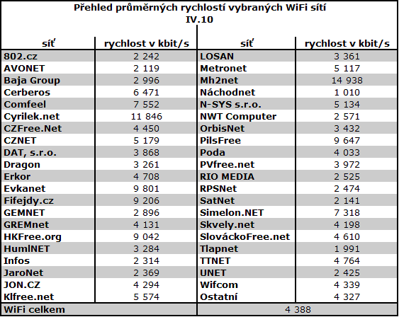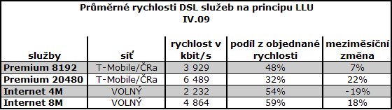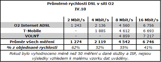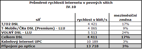 DSL od O2 poprvné rychlejší než DSL na principu LLU od T-Mobile (v bývalé síti Radiokomunikací). Průměrné rychlosti kabelového internetu od UPC poprvé přesáhly 10 Mbit/s. Nejrychlejší 3G síť má O2.