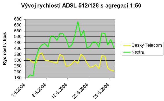 Největší překvapení přinesly v minulém měsíci rychlosti ADSL od Nextry s deklarovanou rychlostí 512/128 kb/s a agregací 1:50. Průměrné dosahované rychlosti se více než zdvojnásobily, protože ve výsledcích se objevilo velké množství měření, kde rychlost přesahovala 512 kb/s. Důvodem byla změna parametrů pro službu ADSLink Basic 512/128 kb/s, u které Nextra zákazníkům objednala z velkoobchodní nabídky Českého Telecomu rychlost 1024/256 kb/s. Z velkých poskytovatelů stojí za upozornění stabilně slušné rychlosti Contactelu. Je to způsobeno tím, že společnost nikdy nenabízela zcela bezlimitované ADSL s agregací 1:50, a proto doposud nebyla nucena uplatňovat na žádné uživatele Fair User Policy.