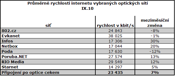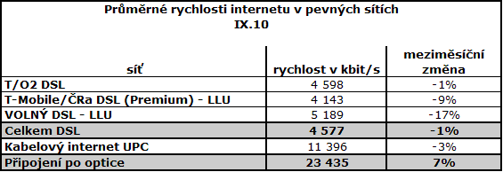 Mobilní internet v ČR za rok zvýšil rychlosti na téměř dvojnásobek a v průměru se blíží 1 Mbit/s. Průměrné rychlosti optických přípojek poprvé nad 23 Mbit/s. Podle počtu měření počet optických přípojek možná již převýšil počet DSL přípojek na principu LLU.