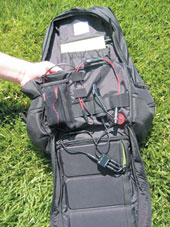 sluneční panely, schopné generovat až 4 Watty. Uvnitř batohu je 2 200