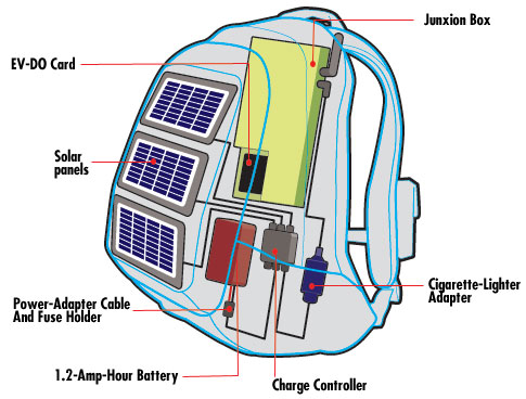 telefon. Potřebujeme k tomu tři maličkosti – bezdrátový gateway firmy Junxion Box za 700 dolarů, EV-DO PMCIA kartu firmy Verizon Wireless za 100 dolarů a batoh se solární nabíječkou, které prodává firma Voltaic Systems za dalších 230 dolarů. Potom už nezbývá, než dokoupit si pár drobností, jakými jsou 12voltová baterie, konektory a pár drátů, všechno dohromady v ceně kolem 35 dolarů, a chvilka kutění v dílně.
