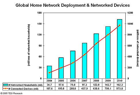 Co se technologií domácích sítí týká, je situace celkem jasná: bezdrátové sítě vedou. Podle právě zveřejněné zprávy společnosti In-Stat „Digital Domicile 2005: Wireless Overtakes Ethernet“ jsou WLAN 802.11g s 54 Mbit/s nejčastějším řešením propojení domácích zařízení. Celkový trh se zařízeními pro domácí sítě se má podle autorů vyšplhat na 21 miliard dolarů v roce 2009.