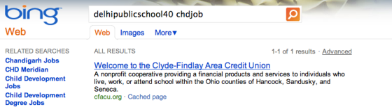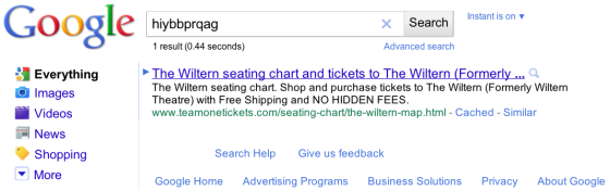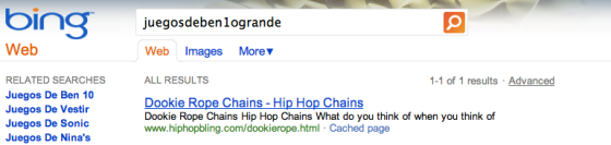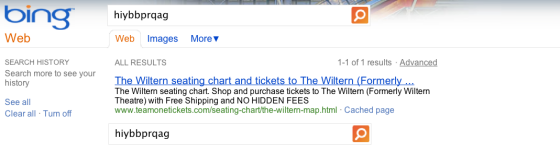 Výsledky vidíte na obrázku níže. Bing vrátil na nesmyslný dotaz, na syntetický řetězec znaků, odkaz na tutéž stránku, kterou do výsledků svého vyhledávače ručně vložili zaměstnanci Googlu.