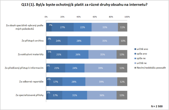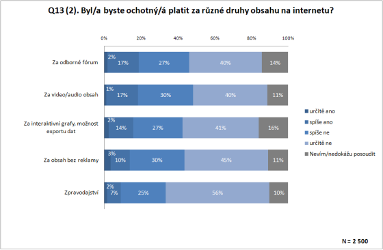 „Více než třetina českých internetových uživatelů uvádí, že by byla ochotna zaplatit za obsah speciálně vybraný podle svých požadavků. Více jak čtvrtina uživatelů by byla ochotna platit za přístupy k archivům, exkluzivním materiálům a za předčasný přístup k informacím. Naopak nejmenší ochota platit by byla za zpravodajství a obsah bez reklamy. Online reklama je vnímána jako přijatelný kompromis za množství zdarma dostupného obsahu,“ uvádí zpráva.