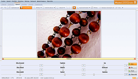 Nyní se podíváme podrobněji na možnosti, které lze s jednotlivými snímky provádět. Aplikace se snaží být maximálně rychlá a přitom nabídnout dostatečný komfort v práci. Tomu odpovídají také základní editační možnosti – rotace snímků, ořez, změna velikosti, otočení, redukce červených očí, guma, klonování, razítko. Dále je k dispozici práce s horizontem pro vyrovnání snímků, poměrně podrobné nastavení barevnosti nebo efekty. Těch není k dispozici nějak závratné množství, ale nalezneme zde například přidání šumu, rozmazání, změny barev, inverze, ostření, reliéf či pixelizaci. Ač tato nabídka nijak neohromí, poskytuje základní paletu toho, co obvykle se snímky potřebujeme provádět. Pro ty nejpohodlnější je pak připraven nástroj pro automatické vyladění snímku.