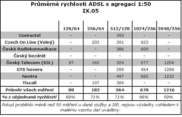 Konkrétní dosahované rychlosti jednotlivých ADSL služeb v síti Českého Telecomu ukazuje následující tabulka.
