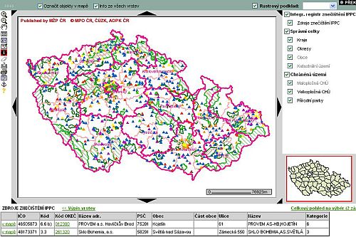 Obrázek ukazuje výřez z mapového serveru, který zobrazuje chráněná území a zdroje znečištění. V levé části okna jsou ikony k ovládání. Například ikonou i a klepnutím v mapě na trojúhelníček znečištění se pod mapou zobrazí údaje o znečišťovateli.