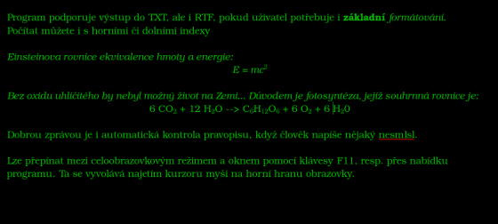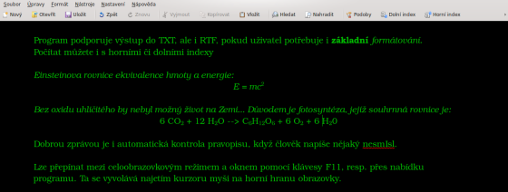Za zmínku jistě stojí to, že uložený text (jak ve formátu TXT, tak i RTF) lze bez problémů otevřít a editovat v normálních, široce používaných textových procesorech, jako je MS Word, resp. třeba Writer z balíku OpenOffice.org/LibreOffice (formátování jako tučné písmo, kurzíva, podtržení, odsazení, mezery mezi odstavci zůstane vždy zachováno).