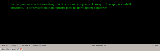 Nakonec jsem objevil právě FocusWriter, který splňuje vše, co se od takového editoru čeká: jednoduché prostředí, které vůbec ničím neruší a jež se dá snadno přizpůsobit, základní funkce pro správu dokumentů a dost dobrá stabilita (nestalo by se mi, že bych přišel o rozdělanou práci). Třešničkou na dortu jsou pak funkce jako plánovač textu (cíle pro to, kolik toho chcete za danou dobu napsat), upozornění, časovače, automatické ukládání aj.