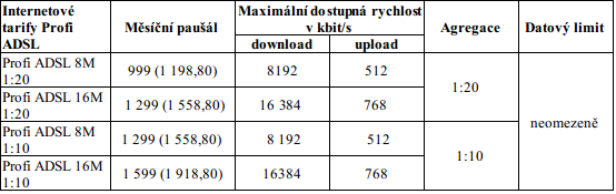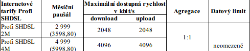 Totéž platí i pro druhou službu zvanou Profi SHDSL. Ta nabízí symetrické DSL připojení s rychlostí 4 Mbit/s (opět ale "až 4 Mbit/s"). Jelikož jde o symetrické připojení, hodnota pro upstream je stejná. Cena služby, v níž jsou 4 statické IP adresy, je asi 3 600 Kč až 6 000 Kč. Agregace je 1:1. Orientační ceny a parametry shrnuje tabulka níže.