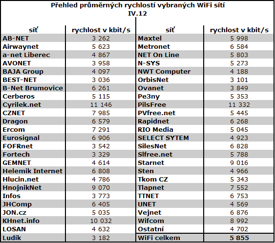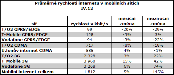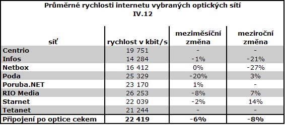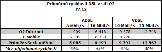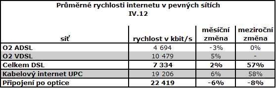 Rychlosti kabelového internetu dohánějí optické připojky a dosáhly rekordních hodnot blížících se průměru 20 Mbit/s. V rychlostech 3G mobilního internetu T-Mobile zvýšil svůj náskok před svými konkurenty.