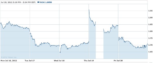 Přesto však výsledky Nokie byly pro mnohé „milým“ překvapením, očekávalo se totiž, že firma na tom bude ještě hůře. Následkem toho posílily i akcie firmy (o zhruba deset procent) – avšak během pár dní opět klesly na (v této době) svou obvyklou hodnotu. Vývoj cen akcí firmy ukazují dva obrázky níže: na prvním je vývoj hodnot ve dnech oznámení finančních výsledků, na druhém pak vývoj akcií během posledních pěti let.