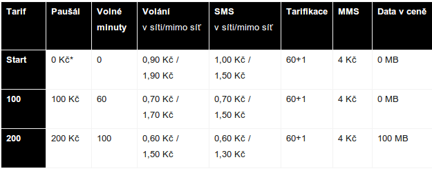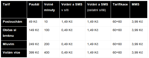Cena za volání se pohybuje od 0,60 Kč do 0,90 Kč za minutu v síti a od 1,50 Kč do 1,90 Kč mimo síť. Lze si objednat i datové balíčky, datových tarifů je celkem pět (50 MB až 1 GB). Cena za data se odvíjí od použitého hlasového tarifu (například k tarifu 200 lze objednat celkem 500 MB za 150 Kč, 1 GB vyjde na 300 Kč). Celou nabídku shrnují tabulky níže.