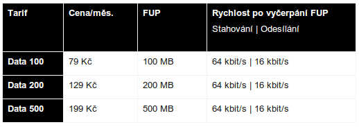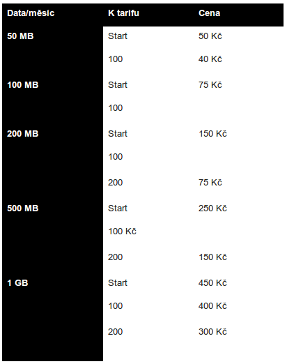 Datová nabídka se skládá ze tří tarifů: k hlasovému paušálu si lze objednat 100 MB, 200 MB a 500 MB.