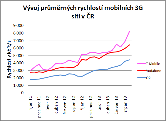 Výrazný vzestup průměrných rychlostí kabelového internetu díky skokovému zrychlení internetových přípojek domácnostem od UPC. Přinášíme graf vývoje rychlostí 3G sítí mobilních operátorů za posledních 24 měsíců, kdy pořadí operátorů podle rychlostí sítí se nemění, ale rychlosti internetu u všech mobilních operátorů výrazně rostou.
