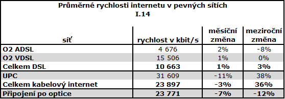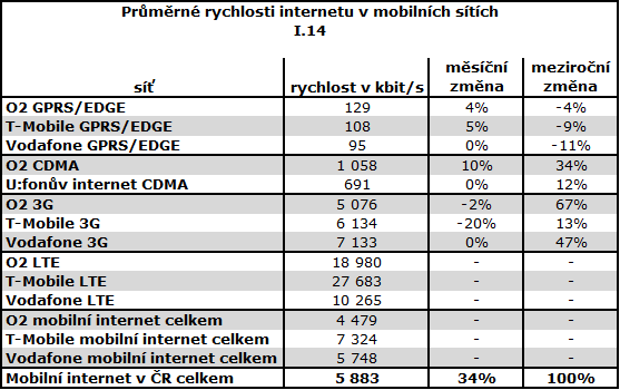 Poprvé zveřejňujeme rychlosti mobilních LTE sítí jednotlivých operátorů, mezi kterými jsou značné rozdíly. Nejrychlejší mobilní síť celkově i LTE má T-Mobile, v 3G sítích zaznamenala prvenství síť Vodafone. Rychlosti kabelové UPC jsou nad úrovní většiny poskytovatelů optického připojení.
