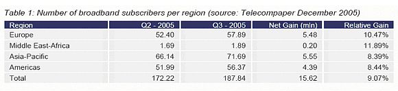 Na konci třetího čtvrtletí letošního roku dosáhl podle zprávy „World Broadband Q3-2005“ společnosti Telecompaper počet uživatelů širokopásmových přípojek na světě celkových 187,8 milionů. V daném čtvrtletí přibylo na světě 15,6 milionů nových uživatelů s největším přírůstkem v asijsko-pacifickém regionu (5,55 milionů; viz tabulka 1), který ovšem v rychlosti růstu zaostal za ostatními oblastmi světa. Evropa zaznamenala druhý největší nárůst (5,48 milionů), což znamená mezičtvrtletní přírůstek ve výši 10,5 %.
