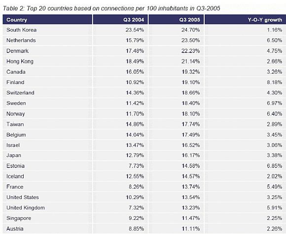 V penetraci širokopásmových přípojek stále vede Korea s 24,7 % (viz tabulka 2), ale její saturovaný trh nedovoluje rozvoj, proto ji ostatní země dohánějí. Největšího úspěchu dosáhlo Holandsko, které je jen o jedno procento na druhém místě, těsně následováno Dánskem. Ale ani jiné evropské země se nemají zač stydět: v první dvacítce (s penetrací přes 11 %) jich najdeme celkem 12. Velkým překvapením je Estonsko, které ze 7 % penetrace v polovině roku dosáhlo za tři měsíce dvojnásobku (14,58 %) a předstihlo nejen Francii a Velkou Británii, ale i USA. Spojené státy jsou až na 17. místě žebříčku.