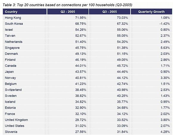 Sedm zemí světa se může chlubit vyšší než padesátiprocentní penetrací rychlých přípojek mezi domácnostmi (viz tabulka 3). V tabulce si všimneme překvapivého minus: Jižní Koreu poprvé postihl pokles počtu širokopásmových přípojek! Ve třetím čtvrtletí se tam snížil počet jak kabelových tak DSL přípojek.