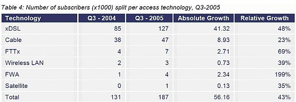 Mezi typy přípojek z hlediska technologie stále více převažuje DSL (viz tabulka 4): na konci třetího čtvrtletí bylo na světě 127 milionů xDSL (roční přírůstek +48 %). „Multimilionové“ přírůstky zaznamenaly země téměř všech kontinentů: Čína s přírůstkem 3,4 milionů DSL, USA s přírůstkem 1,4 milionů a Německo s přírůstkem 1 milionu.