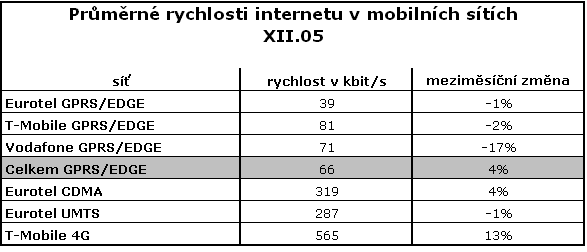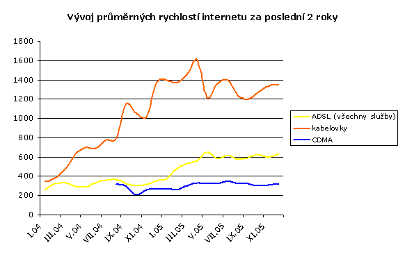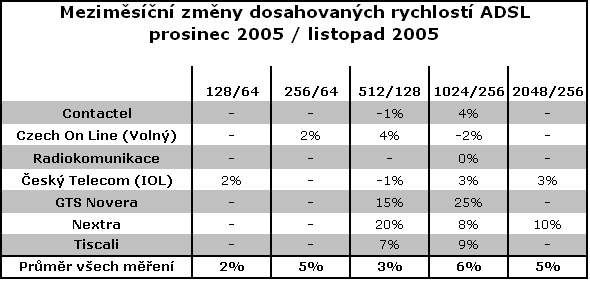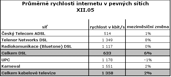 Největší zvýšení průměrných rychlostí, měřených na serveru DSL.cz, zaznamenaly v minulém roce DSL služby. Slušných nárůstů dosáhli i zákazníci bezdrátových sítí. Je jisté, že obě uvedené technologie zaznamenají velké nárůsty průměrných rychlostí i v roce 2006.